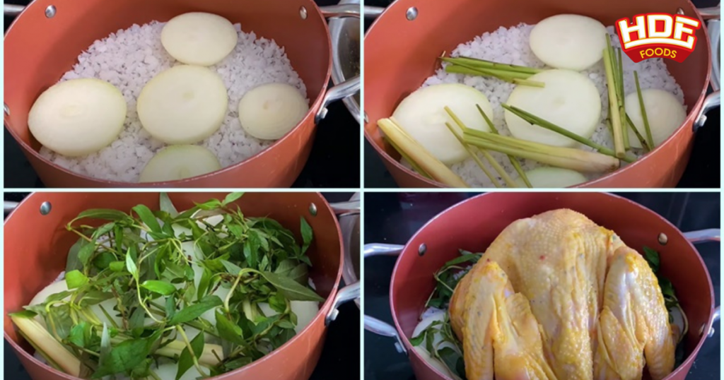 Dùng lá chuối hoặc giấy bạc lót xuống đáy nồi để khi nấu xong dễ vệ sinh rồi đổ 1-2kg muối hạt vào nồi. Đặt lên trên hành tây thái miếng và 5 cây sả đập dập. Sau đó đặt thịt gà lên trên.