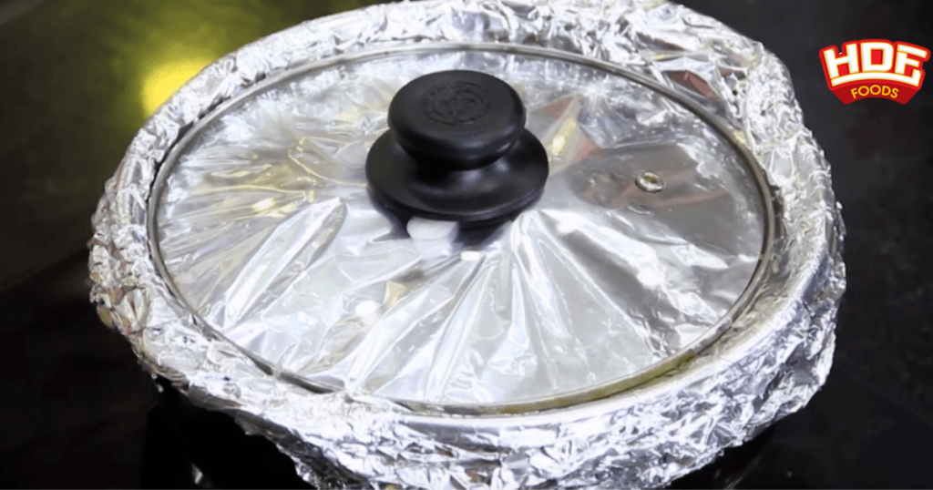 Đạy kín nồi với 1 lớp giấy bạc và bắt đầu hấp thịt gà trong 20-30′. Khi nào không còn nghe tiếng muối nổ thì đã đến lúc thịt gà chín.